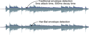 Now you’ll probably think that makes no sense and will sound awful. However it doesn’t sound awful, and here is the reason why. In traditional compression we principally have fast attack and slow release because a compressor cannot predict the future so it doesn’t know when to pull down the level and if it does it slowly a very big transient will push through before it has a chance to bring it down. We have a slow release time because fast gain change will lead to a lot of distortion. Because Har-Bal knows the entire history of the track we don’t need fast attack because we know when to pull the level down. The net result is that the dynamics processing in Har-Bal works more like the volume riding technique of recording engineers of days gone past where they would adjust down the level while the music is being recorded because they knew when the loud parts were coming. This point is clearly illustrated in Figure 11, which shows the difference between envelope detection used traditionally and in Har-Bal.